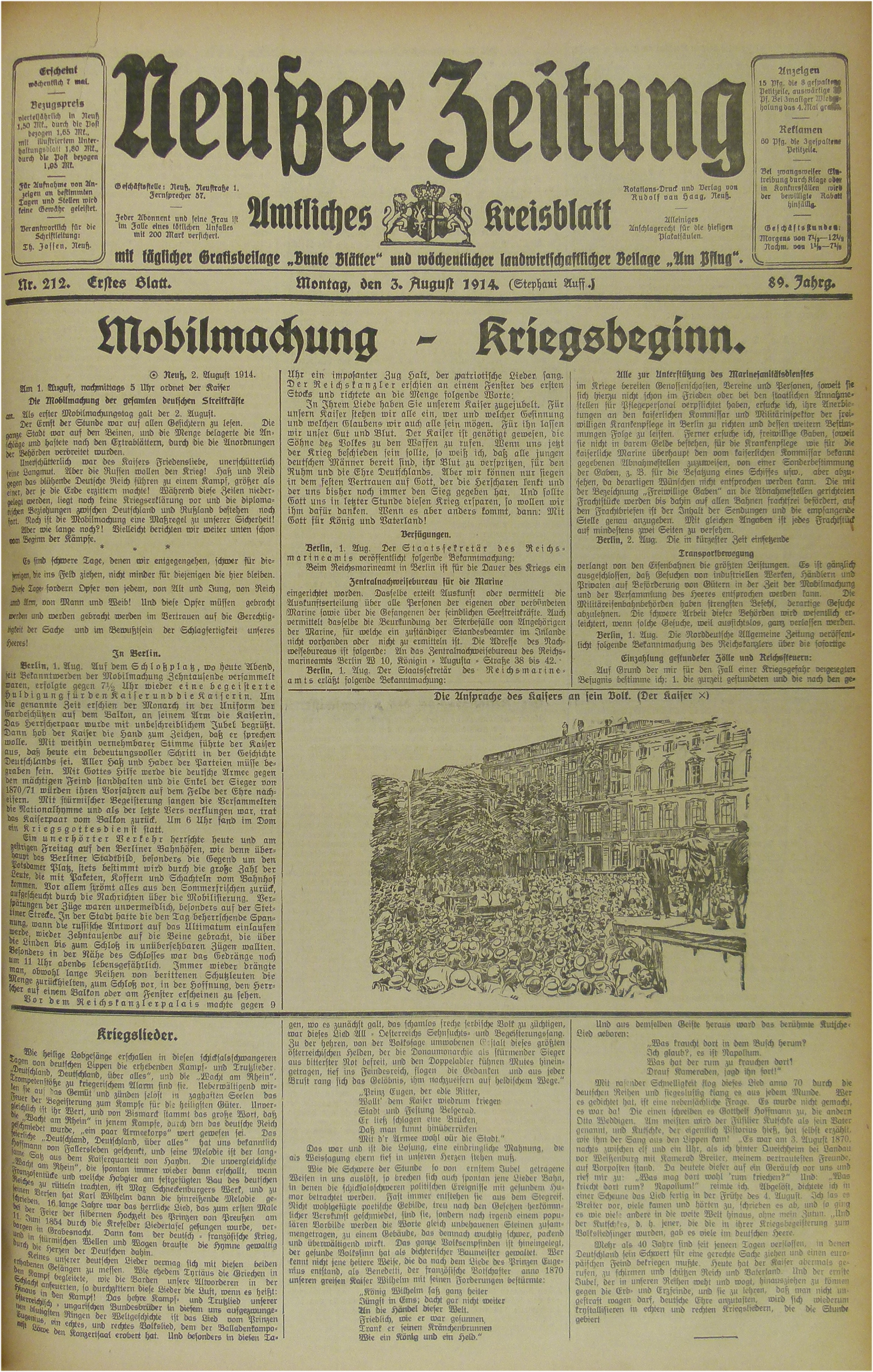 Die folgenden Quellen liegen in der Veröffentlichung des Stadtarchivs "Colin Flaving/Annekatrin Schaller, Neuss im Ersten Weltkrieg. Quellen- und Arbeitsmaterial für die Schule (= Forschen und Lernen im Stadtarchiv Neuss 1)" in gedruckter Form vor. Dort werden sie von einleitenden Texten und Arbeitsaufträgen begleitet. Hier können die Quellen zusätzlich für den Unterricht heruntergeladen werden.
